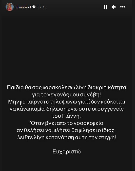 «Παιδιά θα σας παρακαλέσω λίγη διακριτικότητα για το γεγονός που συνέβη! Μην με παίρνετε τηλέφωνο γιατί δεν πρόκειται να κάνω καμία δήλωση εγώ, ούτε οι συγγενείς του Γιάννη. Όταν βγει από το νοσοκομείο, αν θελήσει, θα μιλήσει ο ίδιος. Δείξτε λίγη κατανόηση αυτή τη στιγμή! Ευχαριστώ», έγραψε το γνωστό μοντέλο.