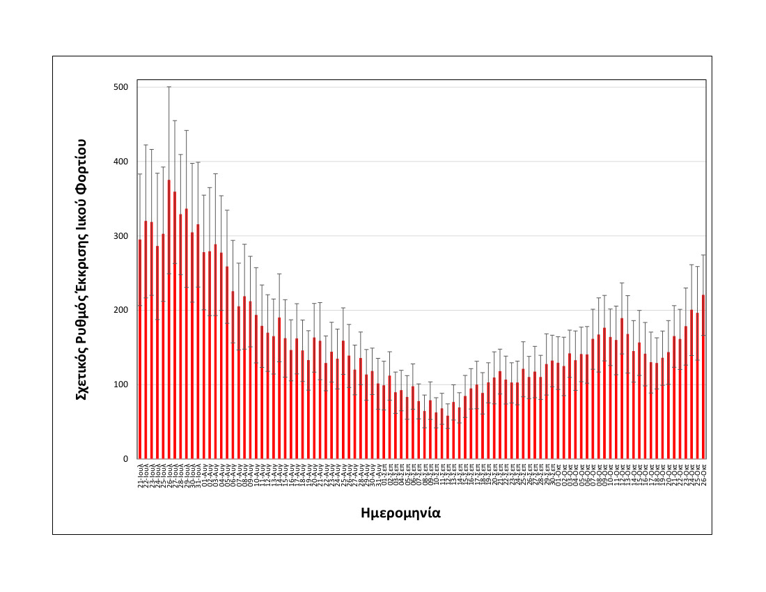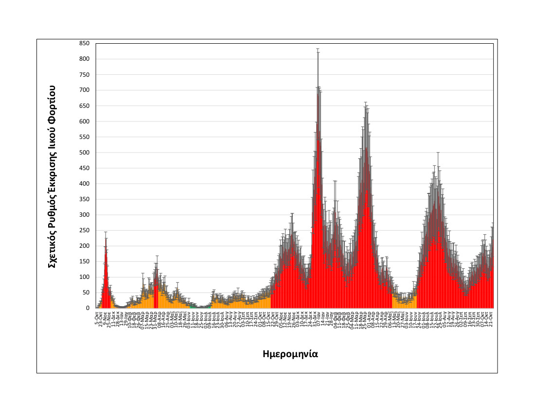 Η μέση εβδομαδιαία τιμή του ιικού φορτίου -από Πέμπτη σε Τετάρτη- αυξήθηκε κατά 26% (αύξηση στο όριο πειραματικής αβεβαιότητος) και ενώ τις προηγούμενες ημέρες υπήρξαν ενδείξεις σταθεροποίησης.