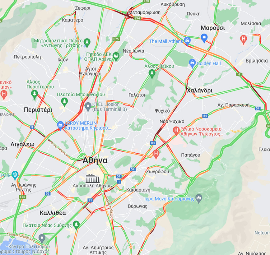 Αυξημένη είναι η κίνηση στη λεωφόρο Μεσογείων, στην Κηφισίας και στα δύο ρεύματα, στη Βασιλέως Κωνσταντίνου και στην άνοδο της Λεωφόρου Συγγρού.