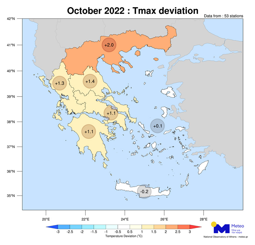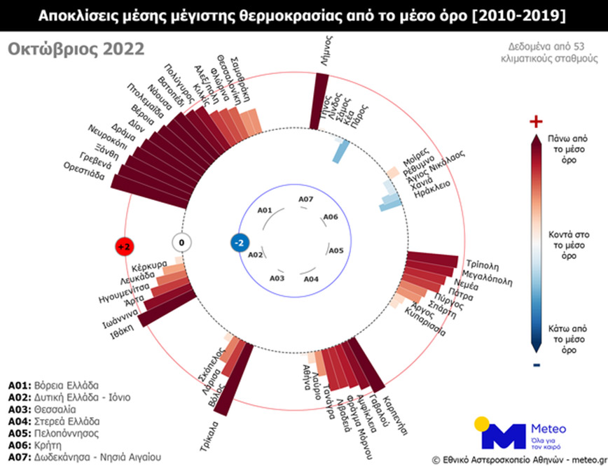 Στο επόμενο γράφημα παρουσιάζονται οι μηνιαίες αποκλίσεις του Οκτωβρίου 2022 σε 53 μετεωρολογικούς σταθμούς του Εθνικού Αστεροσκοπείου Αθηνών/meteo.gr