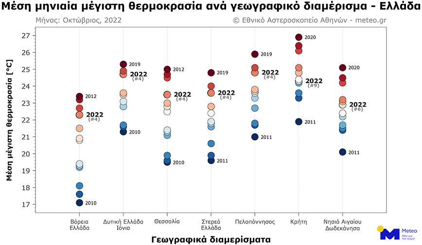 Η Βόρεια Ελλάδα παρουσιάζει τις μεγαλύτερες θετικές αποκλίσεις θερμοκρασίας τον φετινό Οκτώβριο, καθώς και τις περισσότερες ημέρες με θετικές αποκλίσεις. Παρότι η μέση μηνιαία τιμή της μέγιστης θερμοκρασίας ήταν +2°C πάνω από τις φυσιολογικές για την εποχή τιμές, ήταν μόλις ο 4ος πιο θερμός Οκτώβριος της περιόδου 2010-2022, πίσω από το 2019, το 2020 και το 2012.