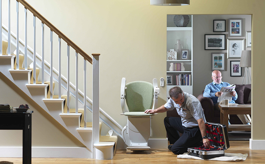 Ποια είναι η χρέωση για την εγκατάσταση του ανελκυστήρα σκάλας? Καμία. Πιστεύουμε ότι η κατασκευή του ανελκυστήρα σκάλας σας είναι μόνο η μισή δουλειά. Η υπόσχεσή μας ότι μπορείτε να ανακτήσετε την ανεξαρτησία σας. εκπληρώνεται μόνο αφού ο ανελκυστήρας σκάλας εγκατασταθεί με ασφάλεια στο σπίτι σας, από τους εξαιρετικά ειδικευμένους τεχνικούς μας. Γι’ αυτό, η εγκατάσταση συμπεριλαμβάνεται στην προσφορά σας. Δεν κάνουμε μισές δουλειές! Το ότι αναλαμβάνουμε εμείς οι ίδιοι την εγκατάσταση, μας επιτρέπει να είμαστε σίγουροι ότι ο ανελκυστήρας σκάλας θα είναι όσο το δυνατόν ασφαλέστερος. Βεβαιωνόμαστε ότι όλοι οι έλεγχοι ποιότητας που εκτελούνται στο εργοστάσιο, εκτελούνται και στο σπίτι σας.