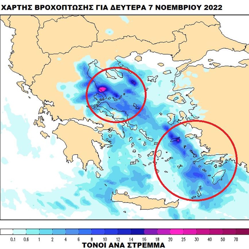 Από τις πρωινές ώρες της Δευτέρας θα επικρατήσει καιρός βορείου ρεύματος προς τα ανατολικά ηπειρωτικά ο οποίος είναι σε θέση να δώσει έντονα φαινόμενα προς τις Σποράδες, την κεντρική και κυρίως την βόρεια Εύβοια αλλά και την ανατολική και νότια Θεσσαλία. Ταυτόχρονα καθώς το βαρομετρικό χαμηλό θα έχει απομακρυνθεί προς το νοτιοανατολικό Αιγαίο θα το συνοδεύουν ισχυρές καταιγίδες στις εκεί περιοχές. Η εξέλιξη αυτή αποτελεί το ΤΡΙΤΟ ΣΤΑΔΙΟ της κακοκαιρίας και αποτυπώνεται χαρακτηριστικά στον τρίτο μας χάρτη.