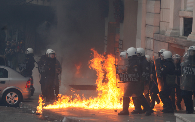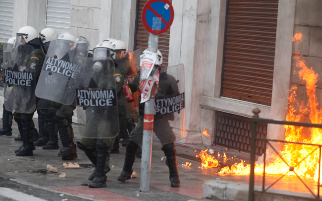 Οι αστυνομικές δυνάμεις απάντησαν με εκτεταμένη χρήση χημικών και άρχισε ένας κλεφτοπόλεμος μεταξύ διαδηλωτών και ΜΑΤ. Δεκάδες μολότοφ έφευγαν προς κάθε κατεύθυνση με αποτέλεσμα να δημιουργηθούν αρκετές εστίες φωτιάς περιφερειακά της πλατείας Συντάγματος. Τα επεισόδια συνεχίστηκαν και σε άλλα σημεία της Αθήνας ενώ μάλιστα κάποιοι έβαλαν φωτιά στα γραφεία της Βουλής, απέναντι από το κεντρικό κτήριο αλλά και στο υπουργείο Οικονομικών.