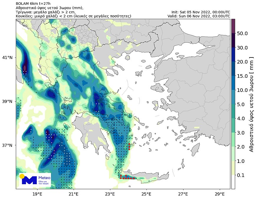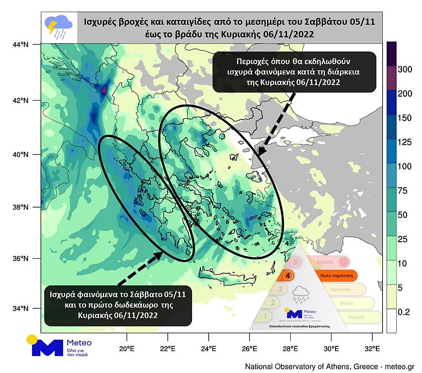 Σύμφωνα με τα προγνωστικά στοιχεία του Εθνικού Αστεροσκοπείου Αθηνών / Meteo.gr, κατά τη διάρκεια του Σαββάτου 05/11 έντονες βροχοπτώσεις και τοπικά ισχυρές καταιγίδες θα επηρεάσουν το σύνολο της Δυτικής Ελλάδας. Μέχρι το βράδυ τα φαινόμενα θα επεκταθούν στα υπόλοιπα κεντρικά και νότια ηπειρωτικά και ενδεχομένως τα δυτικά τμήματα της Κρήτης. Κατά τη διάρκεια της νύχτας προς Κυριακή 06/11 και μέχρι το μεσημέρι της Κυριακής 06/11 θα επηρεαστούν πολλές περιοχές της υπόλοιπης χώρας – συμπεριλαμβανομένων της Θεσσαλονίκης και της Αθήνας.