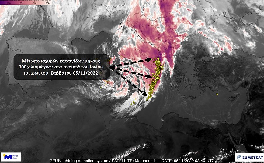 Στη δορυφορική εικόνα που ακολουθεί φαίνεται η θέση και το μήκος του μετώπου. Με κίτρινα σύμβολα αποτυπώνονται οι ανιχνευόμενες ηλεκτρικές εκκενώσεις από το σύστημα ΖΕΥΣ του ΕΑΑ/meteo.gr.