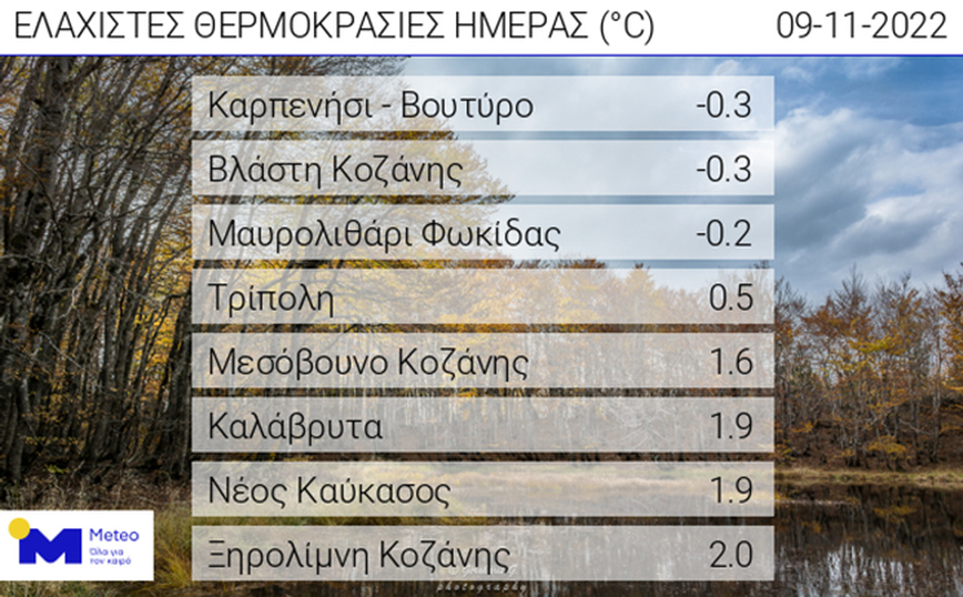 Σύμφωνα με το δίκτυο αυτόματων μετεωρολογικών σταθμών του Εθνικού Αστεροσκοπείου Αθηνών/ meteo.gr, το πρωί της Τετάρτης 9/11, ο υδράργυρος έπεσε λίγο κάτω από το 0 σε ορεινά τμήματα της ηπειρωτικής χώρας.