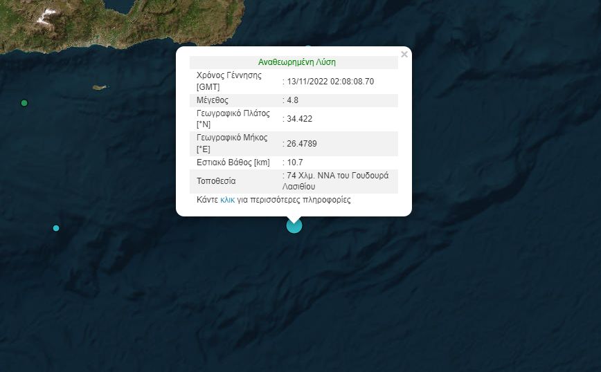 Σεισμική δόνηση μεγέθους 4,8 βαθμών της κλίμακας Ρίχτερ σημειώθηκε τα ξημερώματα της Κυριακής στην Κρήτη και πιο συγκεκριμένα στον θαλάσσιο χώρο ανοιχτά του Λασιθίου.