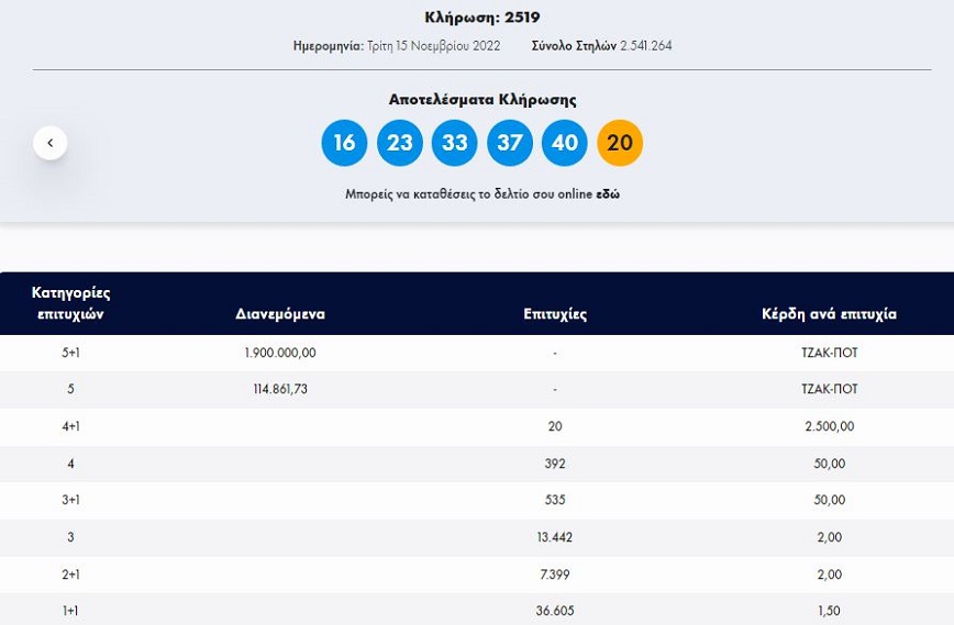 Απόψε, Τρίτη 15 Νοεμβρίου 2022, στην κλήρωση 2519 Τζόκερ του ΟΠΑΠ, θα μοιραστούν στους τυχερούς της πρώτης κατηγορίας τουλάχιστον 1.900.000 ευρώ.