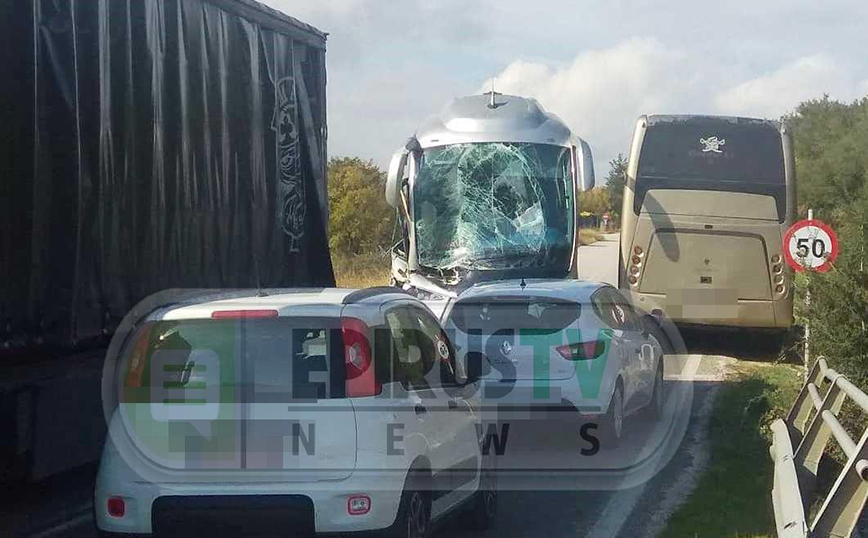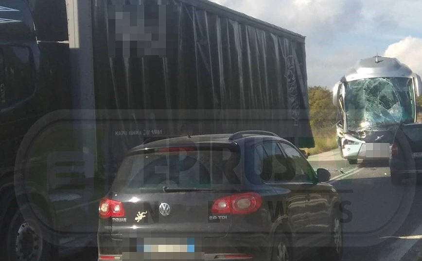 Σύμφωνα με το epirus-tv-news.gr, το οποίο δημοσιεύει και τις φωτογραφίες από το ατύχημα, στο τροχαίο ενεπλάκησαν δύο αυτοκίνητα, μία νταλίκα και ένα λεωφορείο.