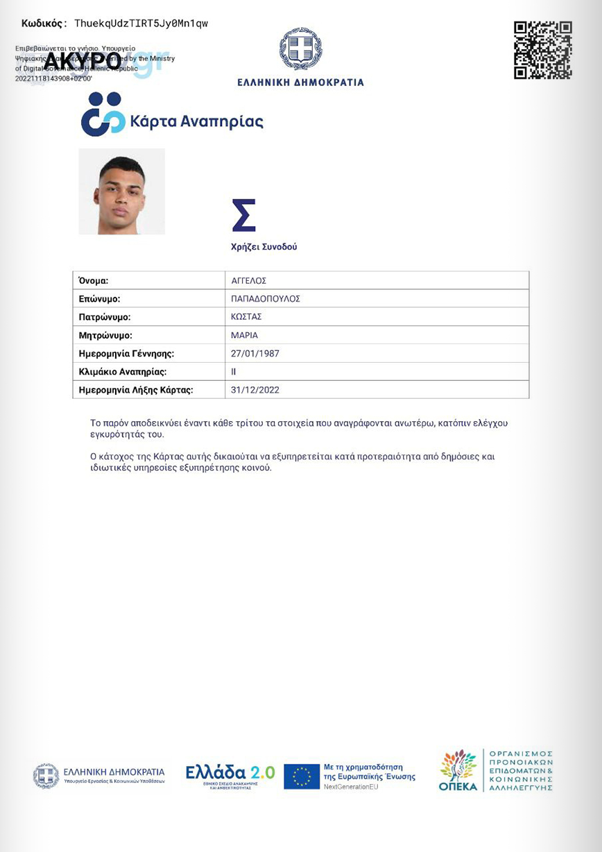 Η Ψηφιακή Κάρτα Αναπηρίας που σχεδιάστηκε σε συνεργασία με την Εθνική Συνομοσπονδία Ατόμων με Αναπηρία (ΕΣαμεΑ) θα λειτουργεί όπως το φοιτητικό πάσο, αποδεικνύοντας την ταυτότητα του κατόχου της και την ιδιότητά του ως ατόμου με αναπηρία έναντι κάθε δημόσιας αρχής και τρίτου. Οι κάτοχοι με την επίδειξή της θα εξυπηρετούνται κατά προτεραιότητα σε υπηρεσίες εξυπηρέτησης κοινού, χρησιμοποιώντας την ως δικαιολογητικό αντί της πιστοποίησης αναπηρίας, χωρίς να απαιτείται να μοιραστούν τα ευαίσθητα προσωπικά –και ιδίως ιατρικά- τους δεδομένα. Στο επόμενο διάστημα θα προστίθενται παροχές στην Κάρτα, ώστε τελικά να ενσωματωθούν όλες οι παροχές που αφορούν σε κάθε ανάπηρο. Η Κάρτα Αναπηρίας μπορεί να εκδοθεί από την 1η Νοεμβρίου ως εκτυπώσιμο έγγραφο (όπως το πιστοποιητικό εμβολιασμού). Από σήμερα είναι διαθέσιμη και ως ψηφιακή εφαρμογή για κινητά τηλέφωνα, αποτελώντας το τρίτο ταυτοποιητικό έγγραφο που μπαίνει στο ψηφιακό πορτοφόλι wallet.gov.gr. Το αμέσως επόμενο διάστημα θα κυκλοφορήσει και σε πλαστική μορφή.