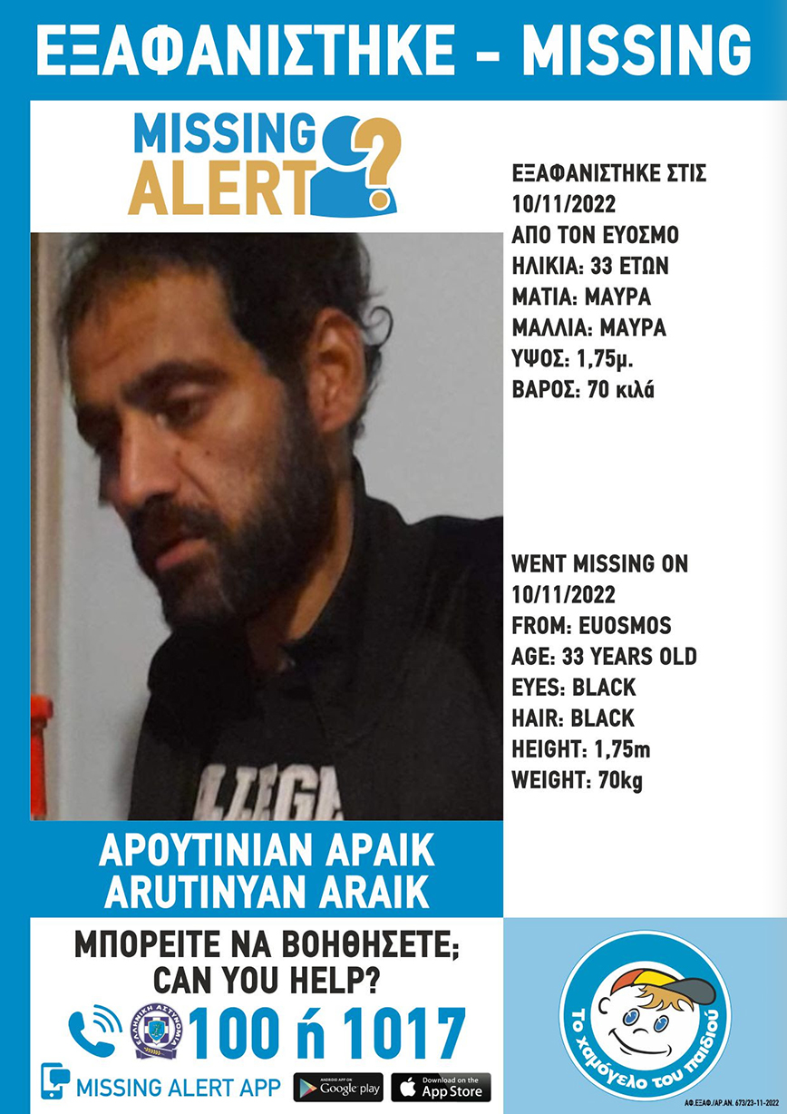 Το «Χαμόγελο του Παιδιού» ενημερώθηκε για την εξαφάνιση του Αράικ Αρουτινιάν στις 15/11/2022 και προχώρησε στη δημοσιοποίηση των στοιχείων του ενήλικου κατόπιν αιτήματος της οικογένειας του καθώς ενδέχεται να συντρέχουν λόγοι οι οποίοι θέτουν τη ζωή του σε κίνδυνο.