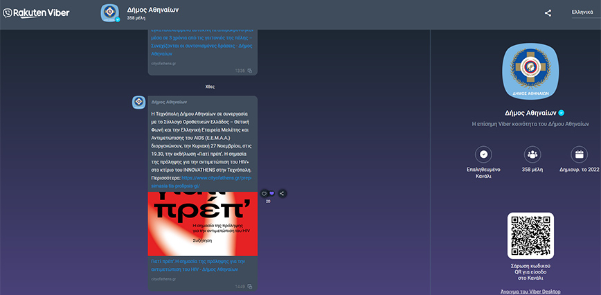 Κάθε δημότης ή επαγγελματίας θα έχει πλέον τη δυνατότητα να εγγραφεί στην επίσημη Viber κοινότητα του Δήμου Αθηναίων και να λαμβάνει τα πιο σημαντικά και ενδιαφέροντα νέα του δήμου: Τις επερχόμενες δράσεις και εκδηλώσεις που «τρέχουν» στην πόλη, τις διαθέσιμες ψηφιακές υπηρεσίες, τα έργα που βρίσκονται σε εξέλιξη στην Αθήνα, τις ανοιχτές προσκλήσεις για κατάθεση προτάσεων, τις δωρεάν δράσεις για μικρούς και μεγάλους, πληροφορίες που αφορούν τα αδέσποτα ζώα κ.ά.