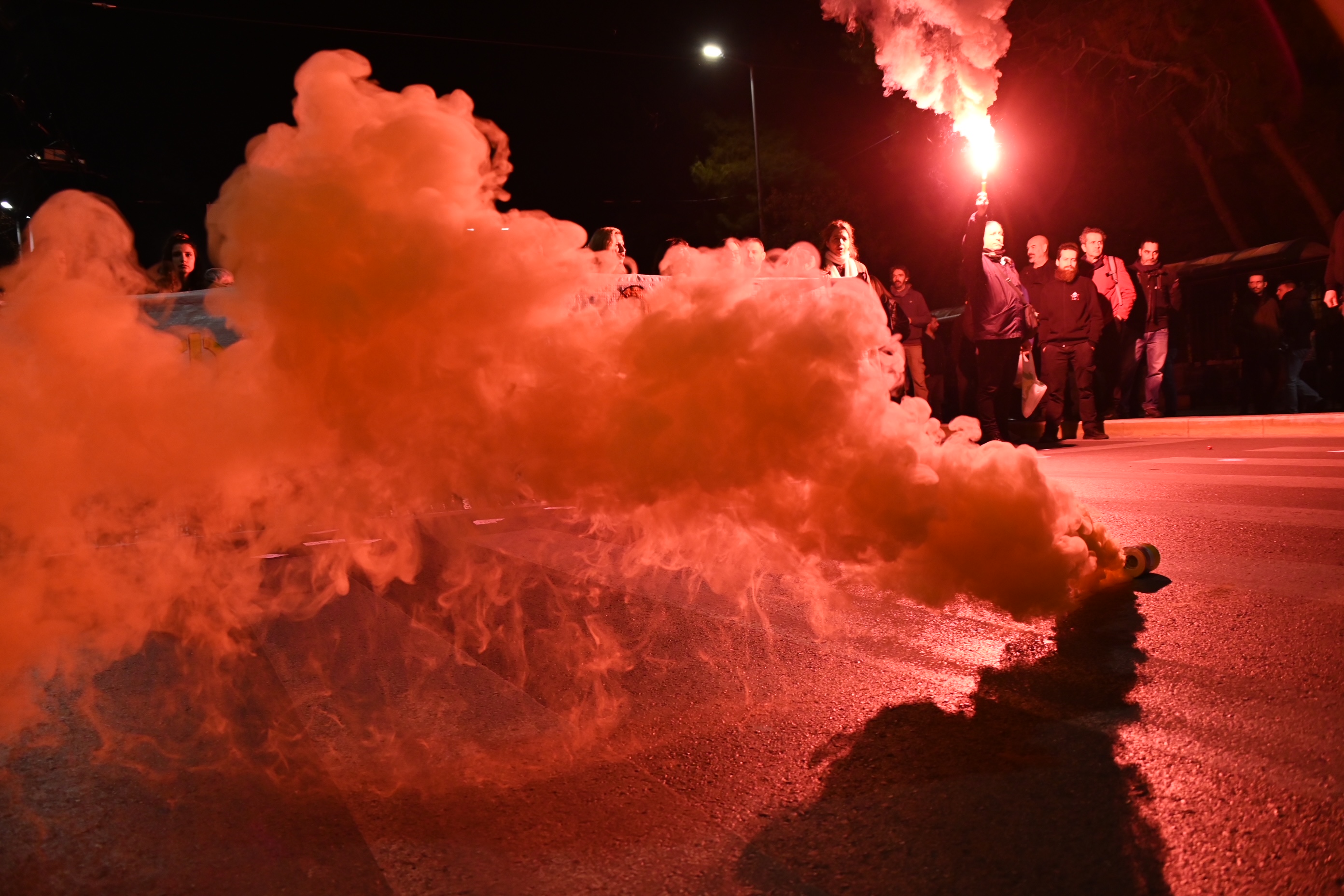 Χίλια περίπου άτομα ανεβαίνουν τη Στουρνάρη κρατώντας πανό, φωνάζοντας συνθήματα ενώ κάποιοι από αυτούς όπως θα δείτε στις εικόνες έχουν ανάψει και καπνογόνα.
