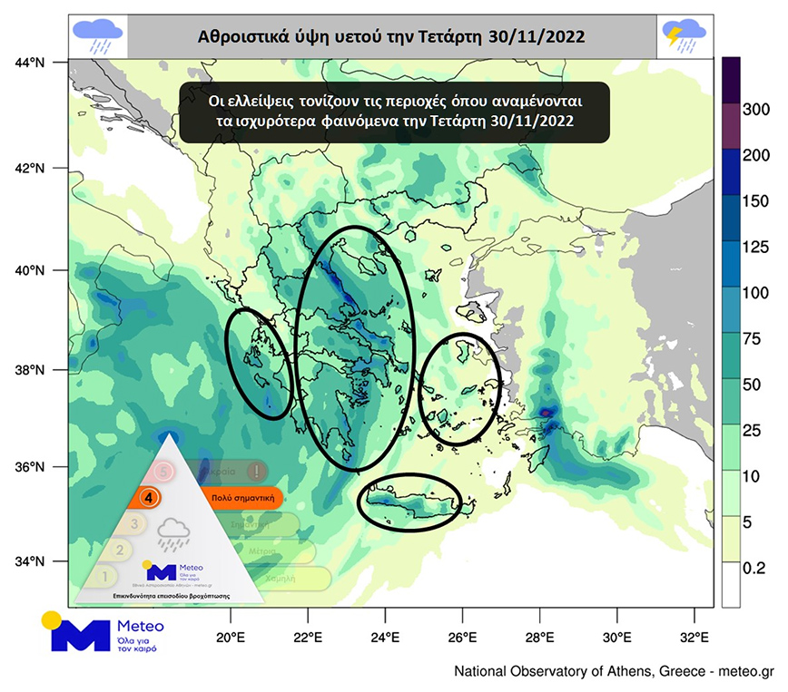 - Κατά τη διάρκεια της Τετάρτης 30/11 τα φαινόμενα θα επεκταθούν στα υπόλοιπα ηπειρωτικά, στην Κρήτη και το Αιγαίο, ενώ την Πέμπτη τα ισχυρότερα φαινόμενα θα εντοπίζονται στη Μακεδονία, τη Θράκη, το Ανατολικό Αιγαίο, τις Κυκλάδες και τα Δωδεκάνησα.