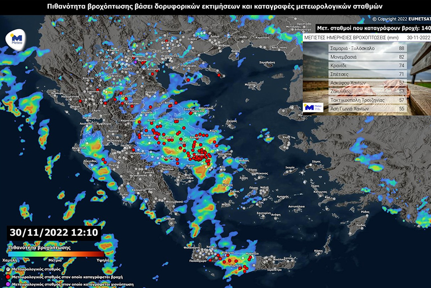 Στην εικόνα που ακολουθεί το meteo.gr παρουσιάζει τις περιοχές όπου υπήρξε πιθανότητα βροχόπτωσης καθώς και οι σταθμοί όπου καταγράφηκε βροχόπτωση κατά το διάστημα 11:55 – 12:10 της Τετάρτης 30/11. Μέσα στην εικόνα περιέχεται πίνακας με τα 8 μεγαλύτερα ύψη βροχόπτωσης στη χώρα κατά το πρώτο δωδεκάωρο της ημέρας.