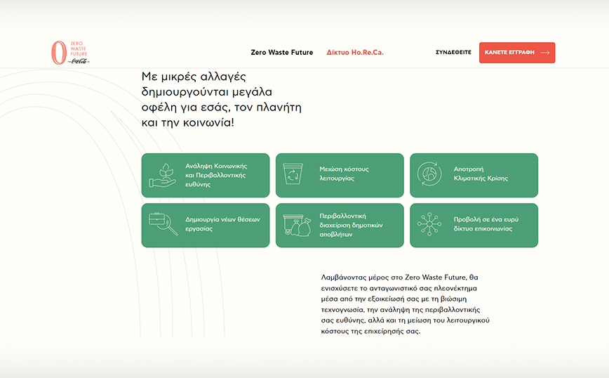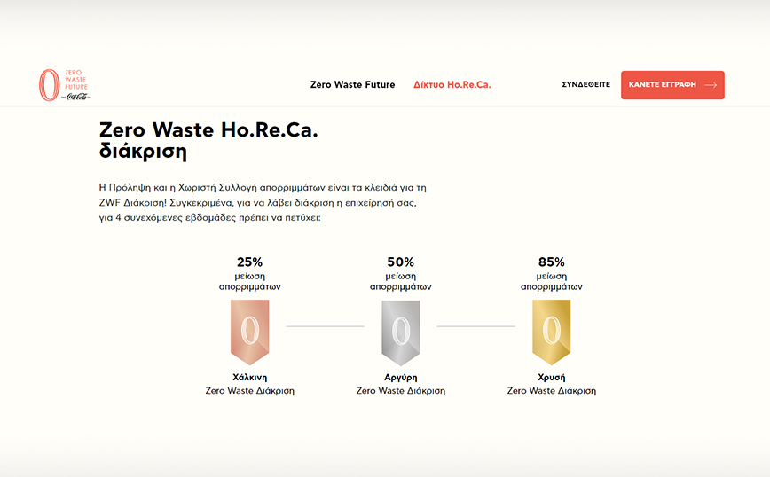 Η νέα ψηφιακή πλατφόρμα εκπαίδευσης και αναγνώρισης Zero Waste HoReCa Hub είναι διαθέσιμη και προσκαλεί τις μικρομεσαίες επιχειρήσεις του κλάδου καφεστίασης και φιλοξενίας, ανεξαρτήτως γεωγραφικής θέσης, να δηλώσουν ενδιαφέρον για να γίνουν μέλη του 1ου Zero Waste HoReCa Δικτύου στην Ελλάδα, να εκπαιδευτούν σε θέματα κυκλικής οικονομίας και να αυξήσουν το ποσοστό ανακυκλώσιμων απορριμμάτων τους, μειώνοντας τα λειτουργικά τους έξοδα.