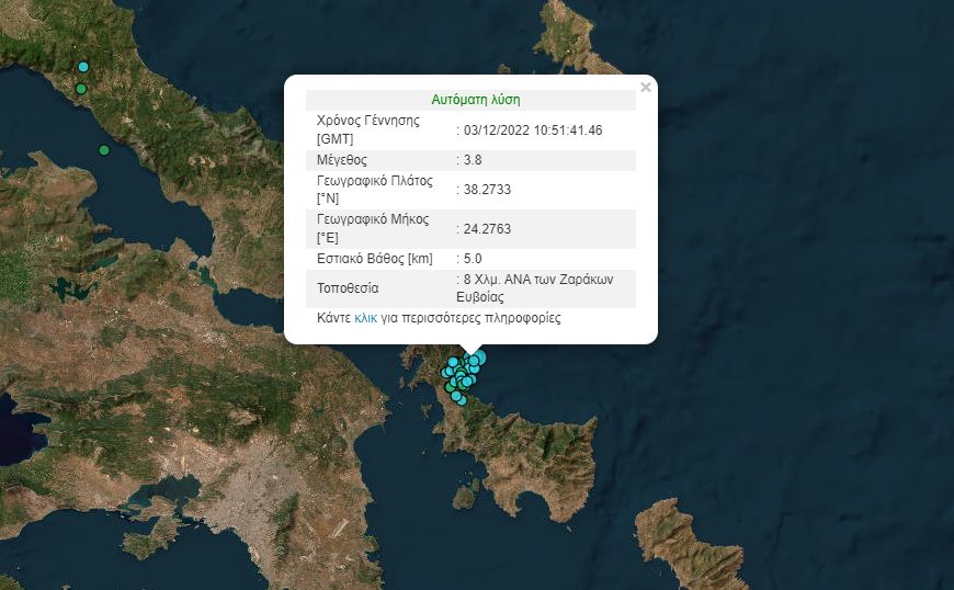 Νέος σεισμός μεγέθους 3,8 Ρίχτερ σημειώθηκε στην Εύβοια πριν λίγο σύμφωνα με το Γεωδυναμικό Ινστιτούτο, λίγο μετά τα 3,9 Ρίχτερ που σημειώθηκαν. Κι αυτός έγινε αισθητός στην Αττική.