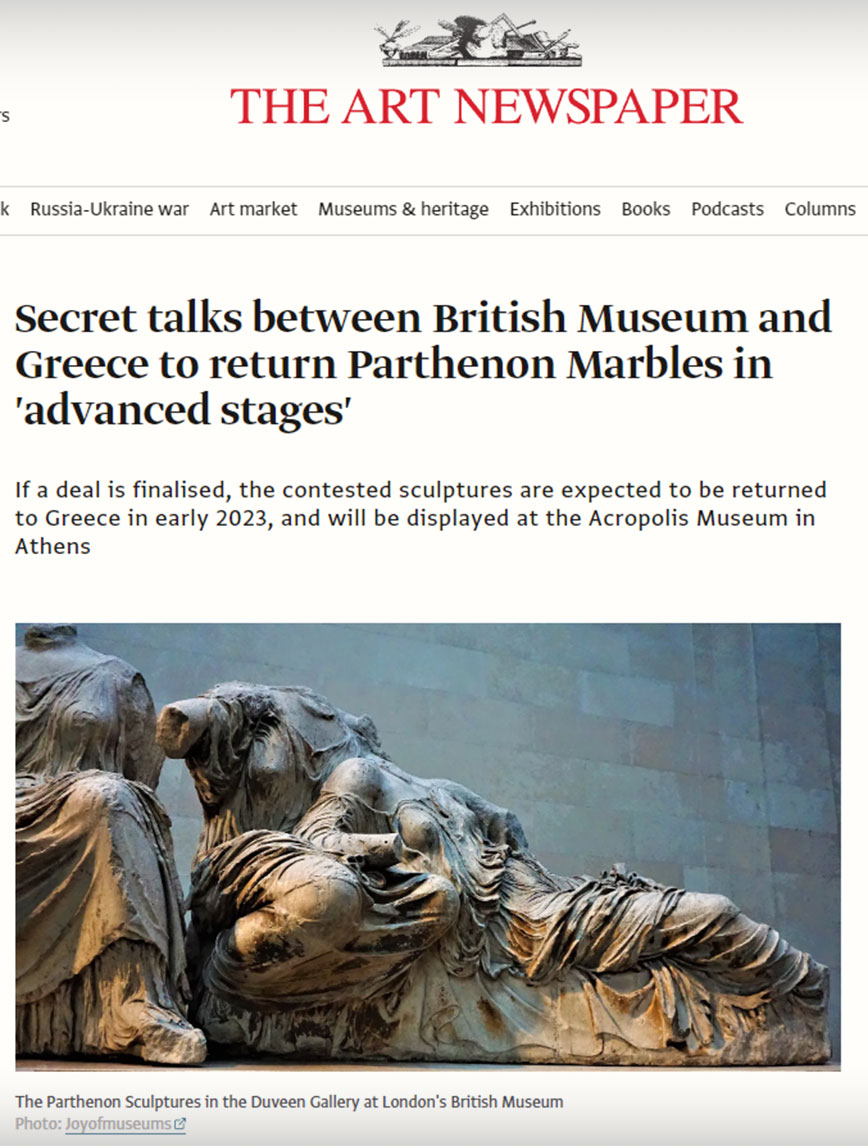 Συγκεκριμένα, το «The Art Newspaper» δημοσίευσε άρθρο με τίτλο «Οι μυστικές συνομιλίες μεταξύ Βρετανικού Μουσείου και Ελλάδας για την επιστροφή των Μαρμάρων του Παρθενώνα είναι σε “προχωρημένο στάδιο”».