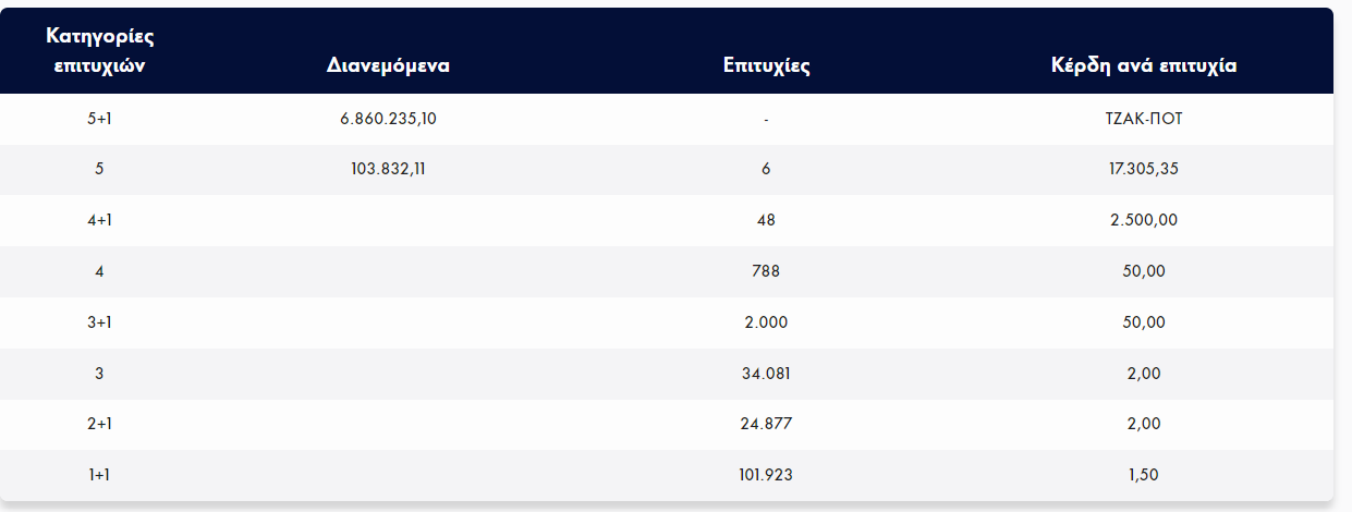 Τζακ Ποτ σημειώθηκε ξανά στην πρώτη κατηγορία, ενώ έξι τυχεροί με 5 επιτυχίες κερδίζουν 17.305 ευρώ. Στην επόμενη κλήρωση θα μοιραστούν 7,6 εκατ. ευρώ στην πρώτη κατηγορία.