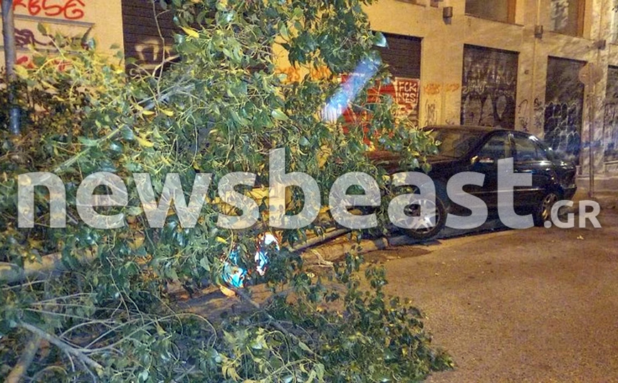 Μέχρι νωρίς το πρωί το πολυτελές Ι.Χ. αυτοκίνητο, το πεσμένο δέντρο και η πινακίδα του ΚΟΚ παρέμεναν στο σημείο.