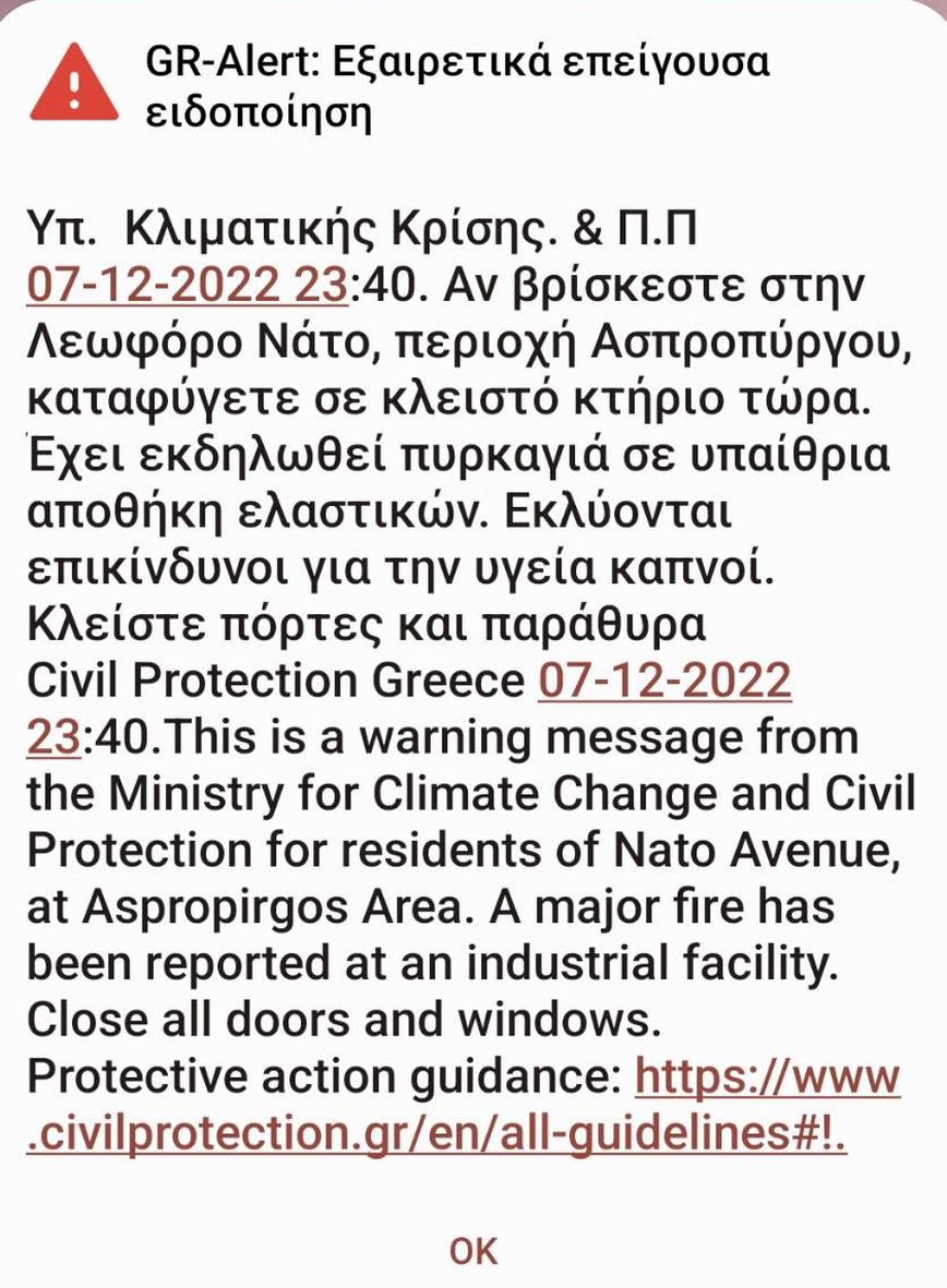 «Αν βρίσκεστε στην Λεωφόρο ΝΑΤΟ, περιοχή Ασπροπύργου καταφύγετε σε κλειστό χώρο τώρα. Έχει εκδηλωθεί πυρκαγιά σε υπαίθρια αποθήκη ελαστικών. Εκλύονται επικίνδυνοι για την υγεία καπνοί. Κλείστε πόρτες και παράθυρα» αναφέρει το μήνυμα του 112.