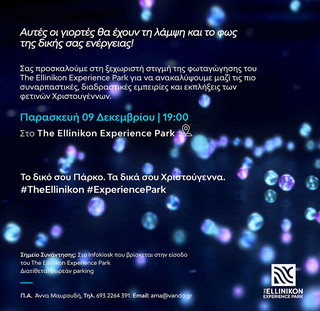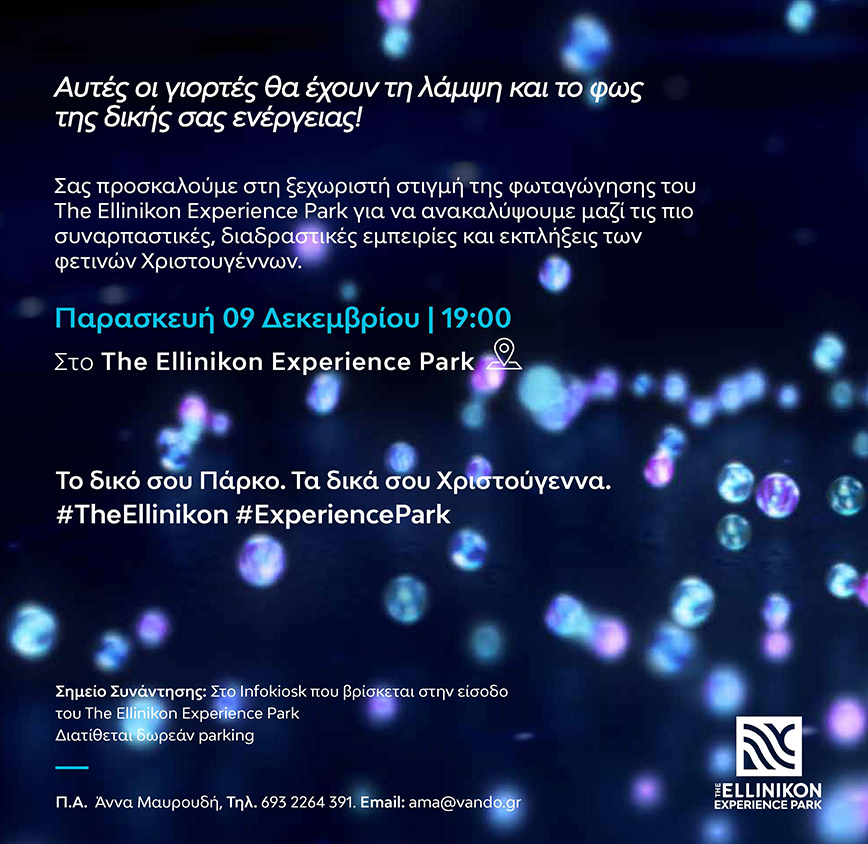 Το The Ellinikon Experience Park σας προσκαλεί στην πιο λαμπερή Χριστουγεννιάτικη εκδήλωση και υπόσχεται μοναδικές εμπειρίες, πολλές εκπλήξεις και αξέχαστες αναμνήσεις. Σήμερα, στις 19:00, το Πάρκο υποδέχεται την εορταστική περίοδο με την πιο εντυπωσιακή εκδήλωση φωταγώγησης! Η γιορτινή βραδιά ξεκινά στο σιντριβάνι, με ένα show που συνδυάζει, μουσική, χορό και φαντασία με τη συνοδεία 12μελούς ορχήστρας υπό τη διεύθυνση του Ανδρέα Τσελίκα. Σειρά έχει το φως που θα μεταμορφώσει το Πάρκο σε ένα εντυπωσιακό, παραμυθένιο σκηνικό, όπου θα κυριαρχεί το μπλε και το μωβ χρώμα. Ένα εντυπωσιακό light show δημιουργεί μαγικές εικόνες και σχέδια στην Πλατεία Α και φωταγωγεί το Χριστουγεννιάτικο Δέντρο. Ο Αττικός Ουρανός γεμίζει χρώματα σε ένα φαντασμαγορικό θέαμα από οικολογικά-πυροτεχνήματα που θα γεμίσουν χρώματα τον Αττικό ουρανό. Την εκδήλωση θα ολοκληρώσει μία συναρπαστική μουσική εμπειρία από το συγκρότημα «Μουσικοί του Κουτιού» της αγαπημένης τηλεοπτικής εκπομπής «Μουσικό Κουτί», γεμάτη ρυθμό και εορταστική διάθεση!