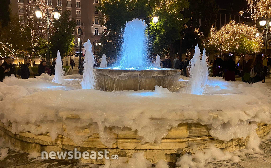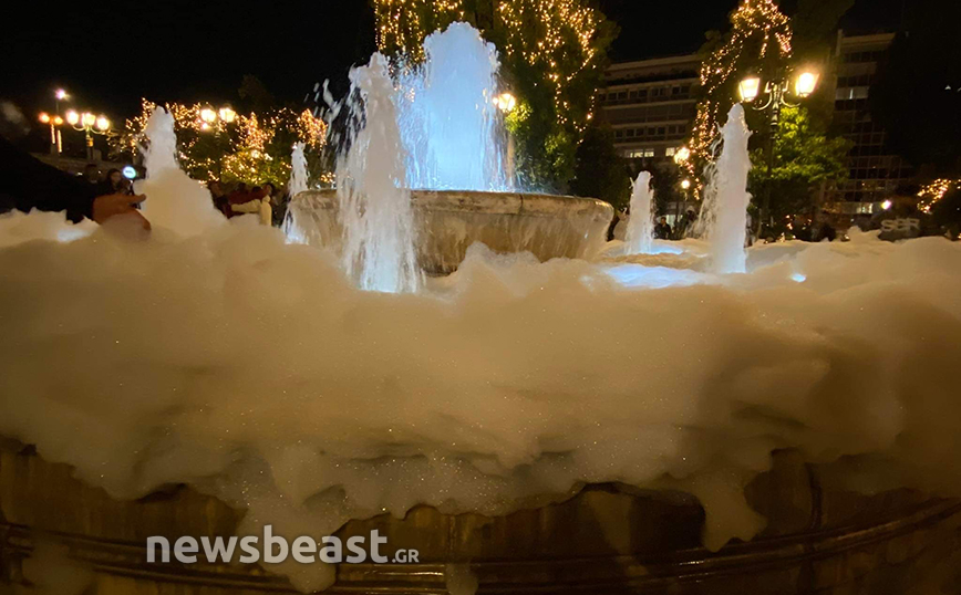 Με ένα απρόσμενο θέαμα ήρθαν αντιμέτωποι οι περαστικοί στην πλατεία Συντάγματος, αφού το σιντριβάνι άρχισε ξαφνικά να αναβλύζει αφρούς, αφού κάποιος ή κάποιοι έριξαν μέσα ένα ειδικό υγρό ή σκόνη που δημιουργεί το σχετικό αποτέλεσμα.