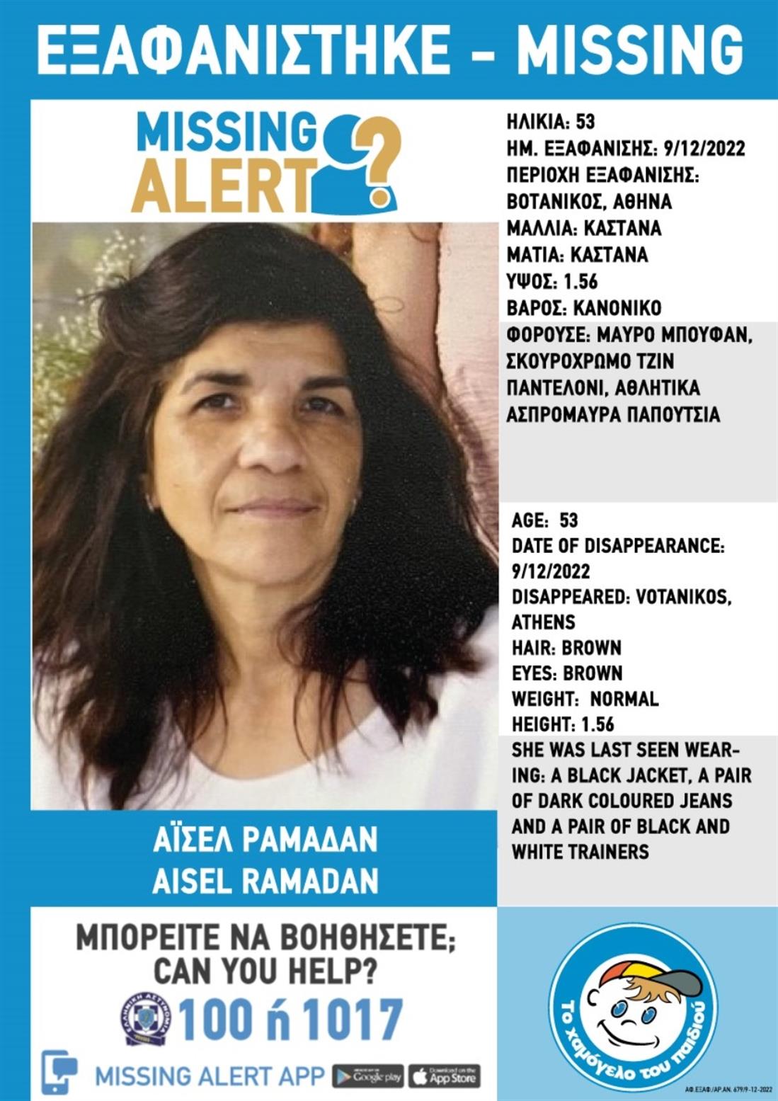 «Στις 09/12/2022, εξαφανίστηκε από την περιοχή του Βοτανικού στην Αθήνα, η Ραμαδάν (επ.) Αϊσέλ (ον.), 53 ετών. Το «Χαμόγελο του Παιδιού» ενημερώθηκε για την εξαφάνιση της Ραμαδάν (επ.) Αϊσέλ (ον.) στις 09/12/2022 και προχώρησε στη δημοσιοποίηση των στοιχείων της ενήλικης κατόπιν αιτήματος των οικείων της καθώς ενδέχεται να συντρέχουν λόγοι οι οποίοι θέτουν τη ζωή της σε κίνδυνο.