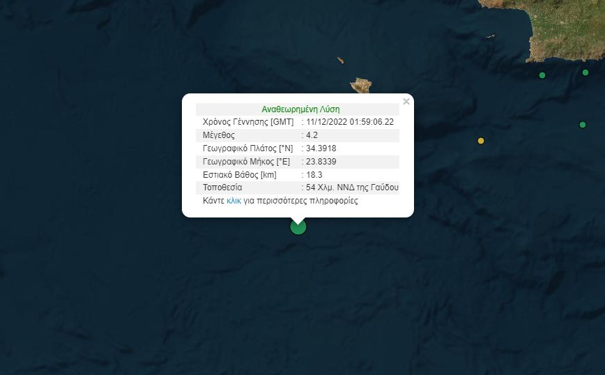 Το επίκεντρο του σεισμού εντοπίζεται στον θαλάσσιο χώρο 54 χιλιόμετρα νότια-νοτιοδυτικά της Γαύδου και το εστιακό βάθος υπολογίζεται σε 18 χιλιόμετρα, σύμφωνα με την ίδια πηγή.