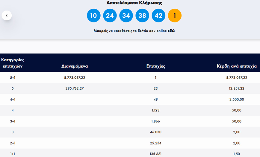 Οι τυχεροί αριθμοί της 2530ης κλήρωσης είναι: 10, 24, 34, 38, 42 και Τζόκερ το 1.