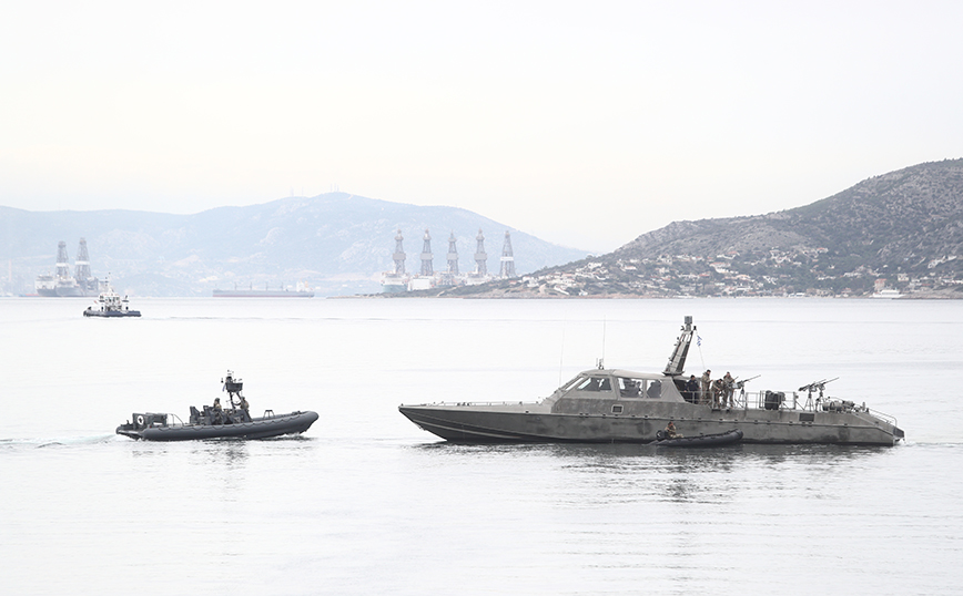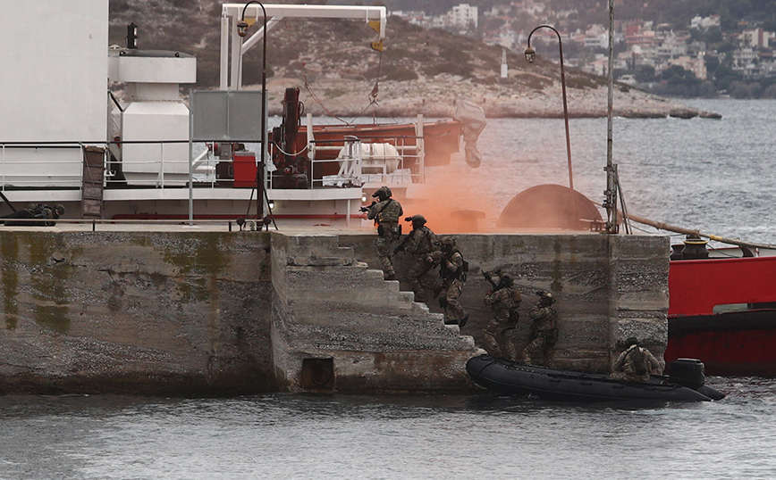 Στη θάλασσα, ομάδα εφόδου των δυνάμεων ειδικών επιχειρήσεων προχωρά με τη μέθοδο Fast Rope από ελικόπτερο Seahawk με την κάλυψη σκαφών, σε μη συναινετική νηοψία σε πλοίο που προσεγγίζει την εγκατάσταση της Ρεβυθούσας.