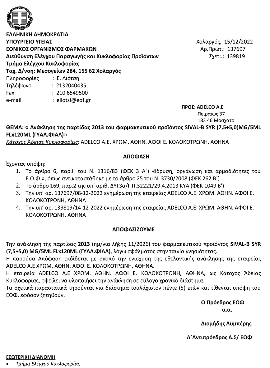 Η παρούσα Απόφαση εκδίδεται με σκοπό την ενίσχυση της εθελοντικής ανάκλησης της εταιρείας ADELCO A.E ΧΡΩΜ. ΑΘΗΝ. ΑΦΟΙ Ε. ΚΟΛΟΚΟΤΡΩΝΗ, ΑΘΗΝΑ.