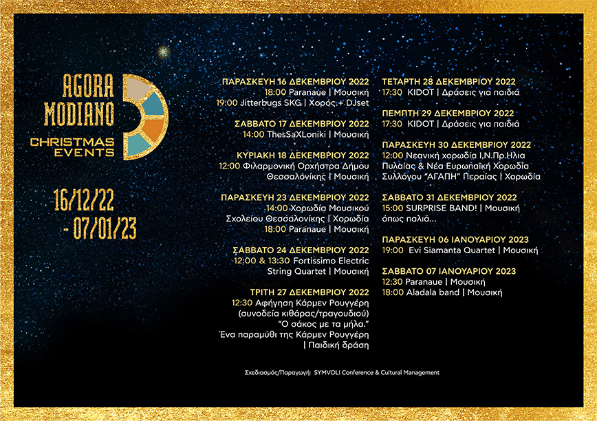 Δείτε το πρόγραμμα παρακάτω, και αναζητήστε περισσότερες πληροφορίες για κάθε εκδήλωση από την ιστοσελίδα agoramodiano.com και τα μέσα κοινωνικής δικτύωσης, σε εβδομαδιαία βάση.