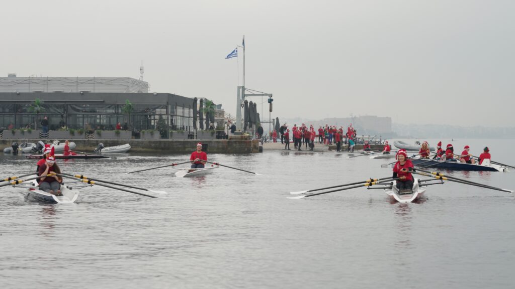 Ο λόγος για περίπου 80 μέλη του τμήματος παράκτιας κωπηλασίας ενηλίκων του Ομίλου Φίλων Θαλάσσης, που φόρεσαν γιορτινά ρούχα και μπήκαν στο νερό για να διασκεδάσουν οι ίδιοι, αλλά και να υπενθυμίσουν σε όσους βρισκόταν κατά μήκος της Νέας και της Παλιάς Παραλίας της Θεσσαλονίκης, ότι πλησιάζουν τα Χριστούγεννα.