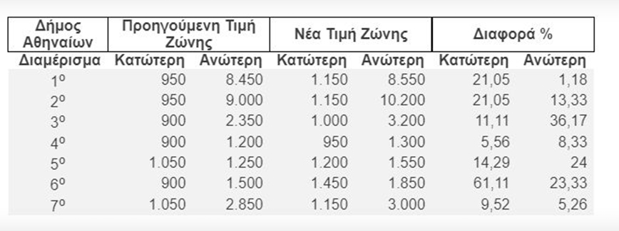 Στον ακόλουθο πίνακα καταγράφονται οι αλλαγές στις τιμές ζώνης και το ποσοστό της αύξησης. Είναι ενδεικτικό της υπερβολικής μεταβολής των τιμών ότι στην 6η δημοτική κοινότητα, η αύξηση στην τιμή εκκίνησης ανέρχεται σε ποσοστό 61%. Δηλαδή από τα 900 ευρώ που ήταν η κατώτερη, ανήλθε στα 1.450 και από τα 1.500 ευρώ που ήταν η ανώτερη τιμή έφτασε στα 1.850.