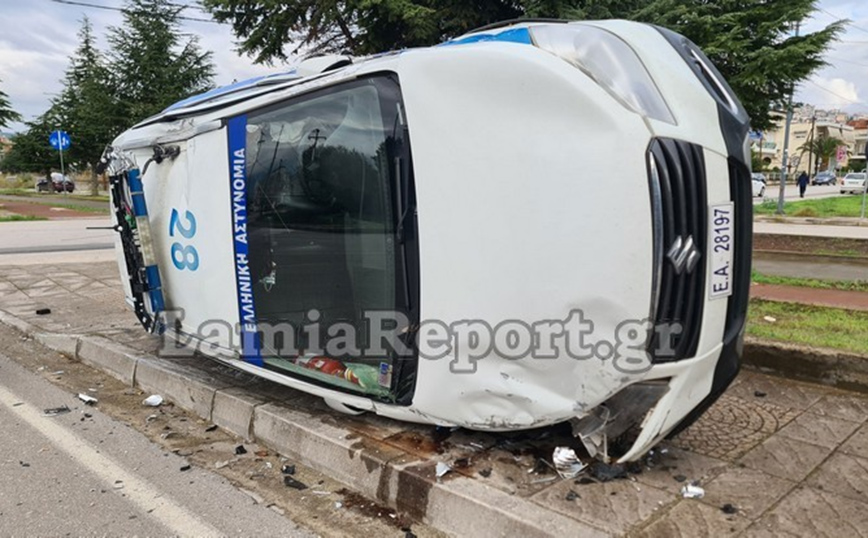 Μετά τη σύγκρουση το περιπολικό «απογειώθηκε» και κατέληξε τουμπαρισμένο πάνω στο πεζοδρόμιο. Το ευτύχημα είναι ότι δεν υπήρχε κάποιος πεζός στο σημείο εκείνη τη στιγμή και ότι από τη σύγκρουση των δύο οχημάτων σημειώθηκαν μόνο υλικές ζημιές.