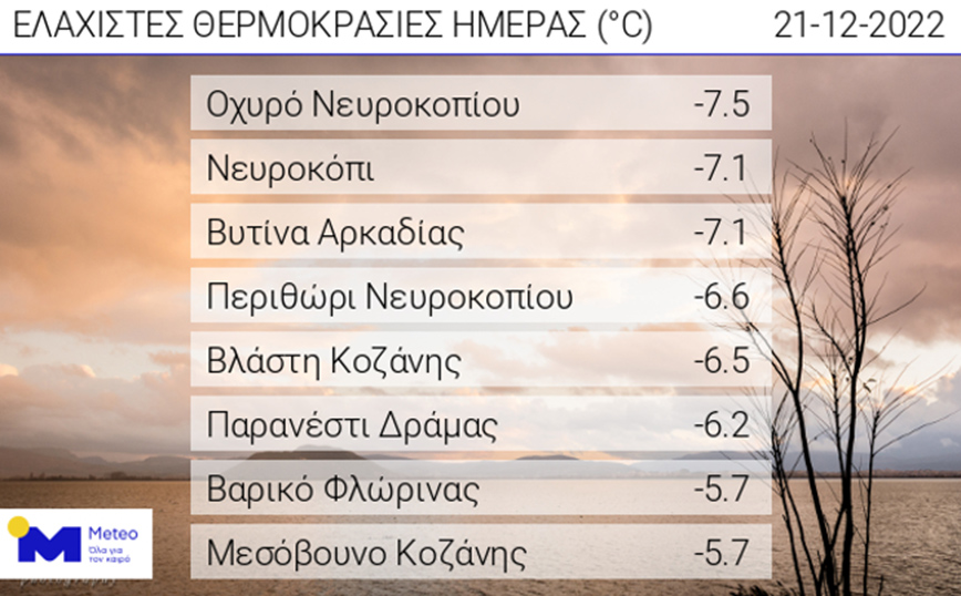 Οι επόμενες χαμηλότερες ελάχιστες θερμοκρασίες καταγράφηκαν σε Νευροκόπι (-7,1), Βυτίνα Αρκαδίας (-7,1), Περιθώρι Νευροκοπίου (-6,6), Βλάστη Κοζάνης (-6,5), Παρανέστι Δράμας (-6,2) και Βαρικό Φλώρινας (-5,7).