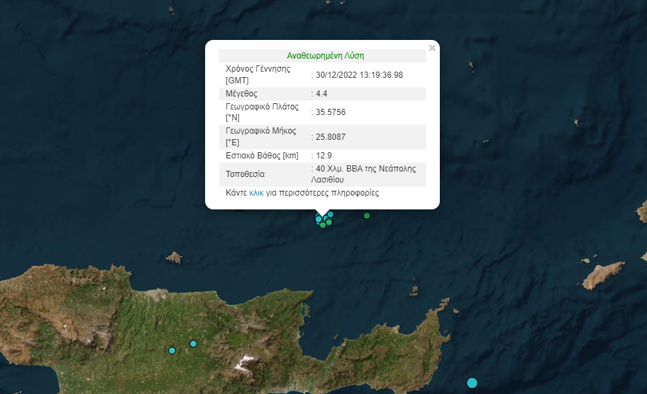 Σεισμός μεγέθους 4,4 βαθμών της κλίμακας Ρίχτερ σημειώθηκε στις 15:19 της Παρασκευής (30/12) στα ανοιχτά της Κρήτης, σύμφωνα με το Γεωδυναμικό Ινστιτούτο.