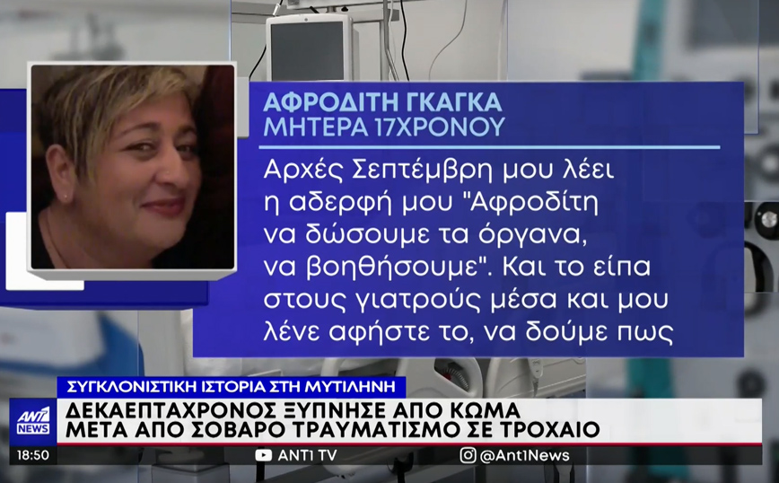 «Αρχές Σεπτέμβρη μου λέει η αδερφή μου “Αφροδίτη να δώσουμε τα όργανα, να βοηθήσουμε”. Και το είπα στους γιατρούς μέσα και μου λένε αφήστε το, να δούμε πώς θα πάει, πώς θα εξελιχθεί και θα το συνεννοηθούμε, θα το κανονίσουμε. Και του Σταυρού τη μέρα, μου λένε οι γιατροί ότι το παιδί άρχισε να αντιδράει. Όταν μου το είπαν δεν ξέρω να σας πως, πώς αισθάνθηκα. Λείπει το μισό του κρανίο. Κρανιοεγκεφαλικές κακώσεις είχε. Την ημέρα του Σταυρού έδειξε σημάδια ότι ξύπνησε ο εγκέφαλος» ανέφερε η μητέρα του 17χρονου Ταξιάρχη Κάϊτατζη.