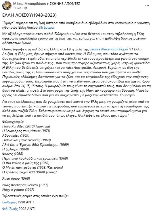 «Έφυγε σήμερα από τη ζωή ύστερα από νοσηλεία δυο εβδομάδων στο νοσοκομείο η γνωστή ηθοποιός Έλλη Λοΐζου. Με αξιόλογη πορεία στον παλιό ελληνικό κινηματογράφο, στο θέατρο και στην τηλεόραση η Έλλη αφιέρωνε παράλληλα χρόνο απ’ τη ζωή της και χρήμα για την περίθαλψη δυστυχισμένων αδέσποτων ζώων», έγραψε η Μάρω Μπουρδάκου.