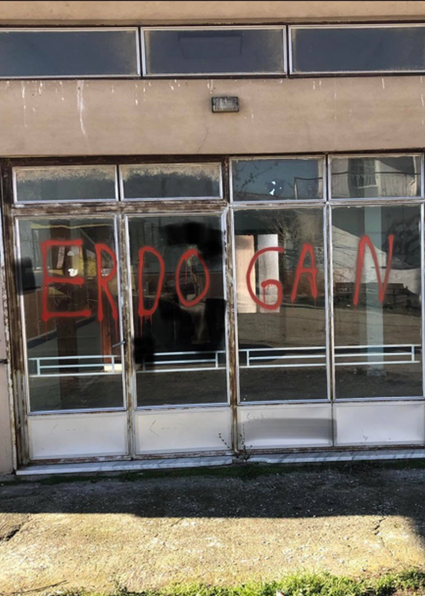 Όπως αναφέρει το evros-news.gr, γύρω από την εκκλησία, σε κατάστημα που είναι κλειστό επί χρόνια, στην στάση του ΚΤΕΛ και σε άλλα σημεία, κάποιοι έγραψαν με κόκκινο σπρέι τις λέξεις ERDOGAN και ΤΟΥRΚΑΪ.