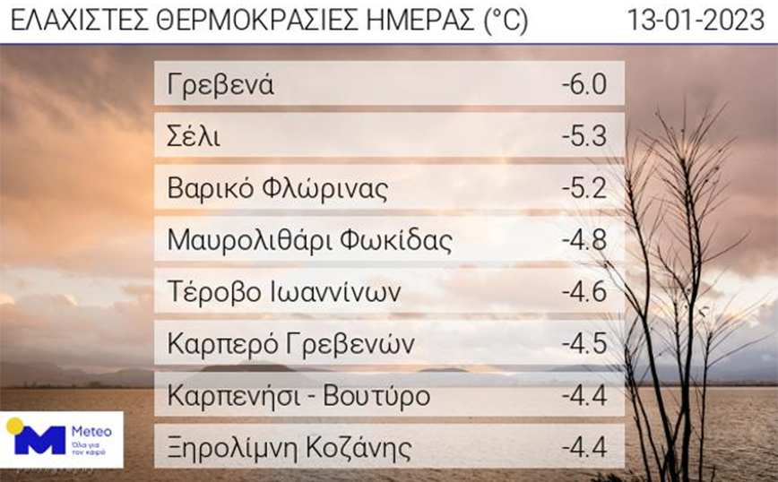 Σύμφωνα με το δίκτυο των αυτόματων μετεωρολογικών σταθμών του Εθνικού Αστεροσκοπείου Αθηνών / meteo.gr οι επόμενες χαμηλότερες ελάχιστες θερμοκρασίες σήμερα το πρωί σημειώθηκαν σε Σέλι (-5,3), Βαρικό Φλώρινας (-5,2), Μαυρολιθάρι Φωκίδας (-4,8), Τέροβο Ιωαννίνων (-4,6) και Καρπερό Γρεβενών (-4,5 βαθμοί).