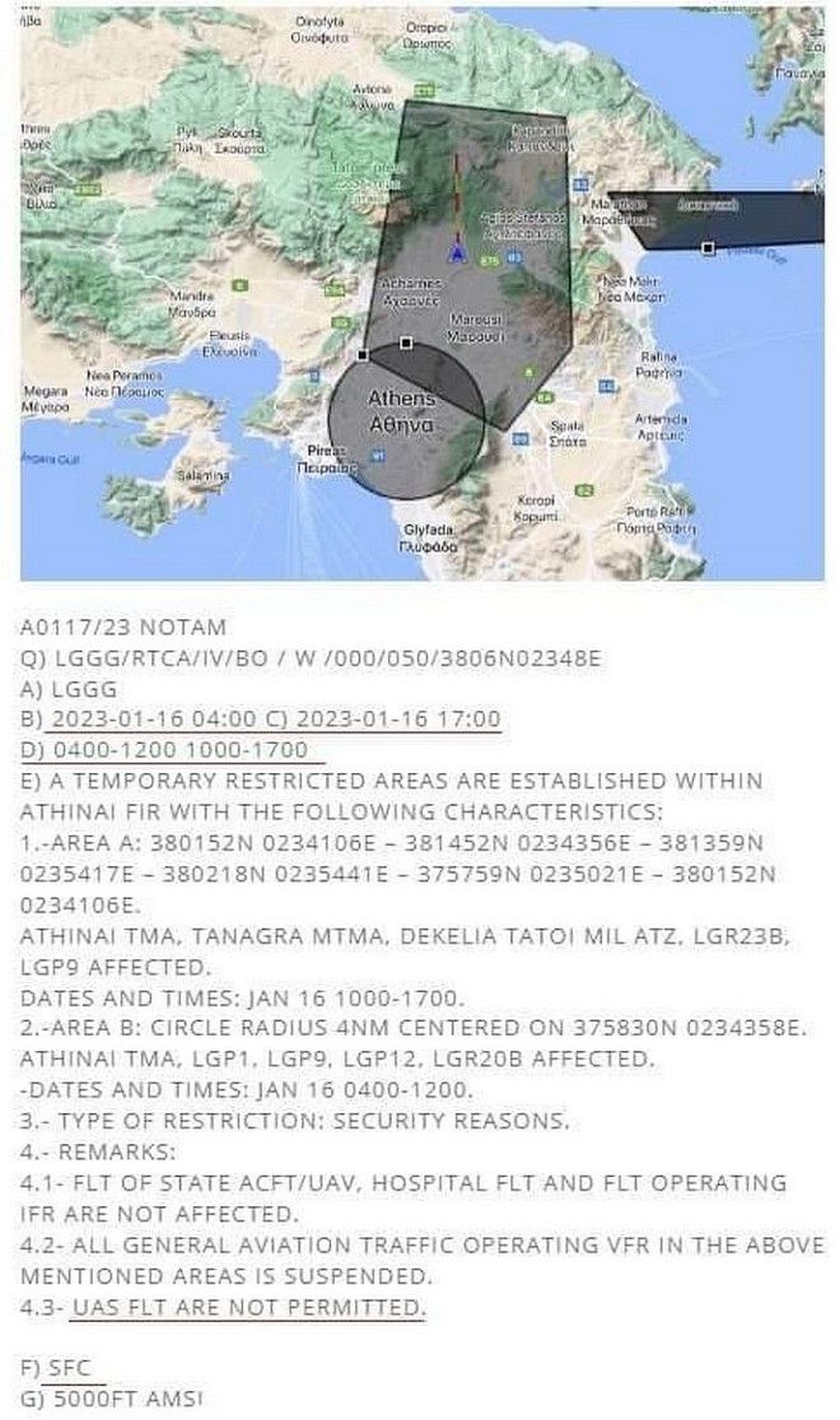 Σύμφωνα με την ΕΡΤ, στο πλαίσιο των μέτρων ασφαλείας εκδόθηκε την Κυριακή (15/01) ΝΟΤΑΜ που προβλέπει προσωρινούς περιορισμούς αύριο στον εναέριο χώρο συγκεκριμένων περιοχών στο κέντρο και στα βόρεια της Αττικής και για συγκεκριμένες ώρες.