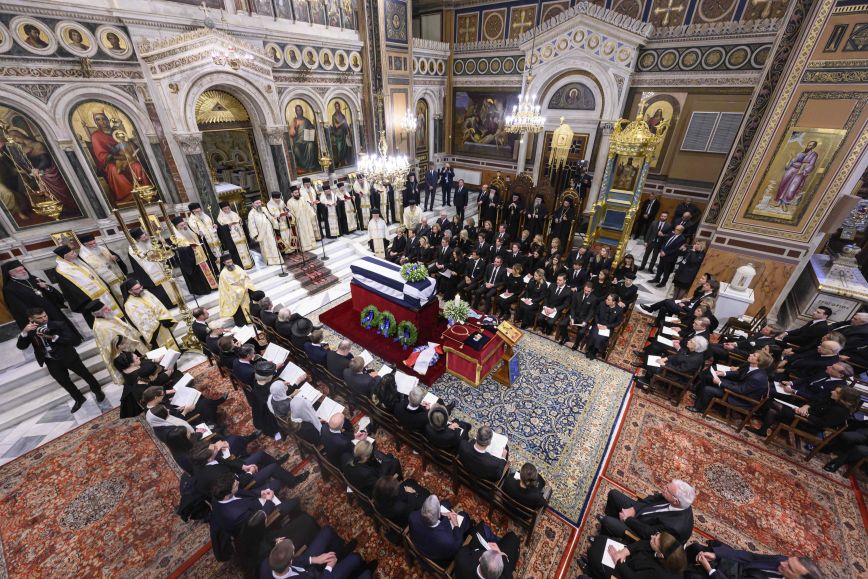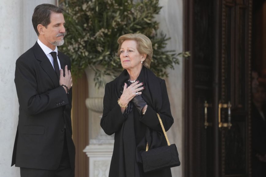 Η σύζυγος του τέως βασιλιά Κωνσταντίνου, Άννα Μαρία, έφτασε στη Μητρόπολη Αθηνών λίγο μετά τις 12:00 για την κηδεία, συνοδευόμενη από τη σύζυγο του γιου της Παύλου, Μαρί Σαντάλ.