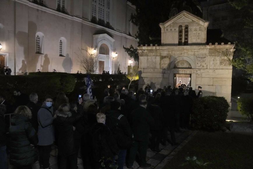 Η σορός του τέως βασιλιά Κωνσταντίνου μεταφέρθηκε στη Μητρόπολη από το παρεκκλήσι του Αγίου Ελευθερίου, όπου είχε τεθεί σε λαϊκό προσκύνημα και πλήθος κόσμου συγκεντρώθηκε από τα ξημερώματα για το τελευταίο αντίο. Η ουρά ήταν τόσο μεγάλη που έφτανε μέχρι την Καπνικαρέα.