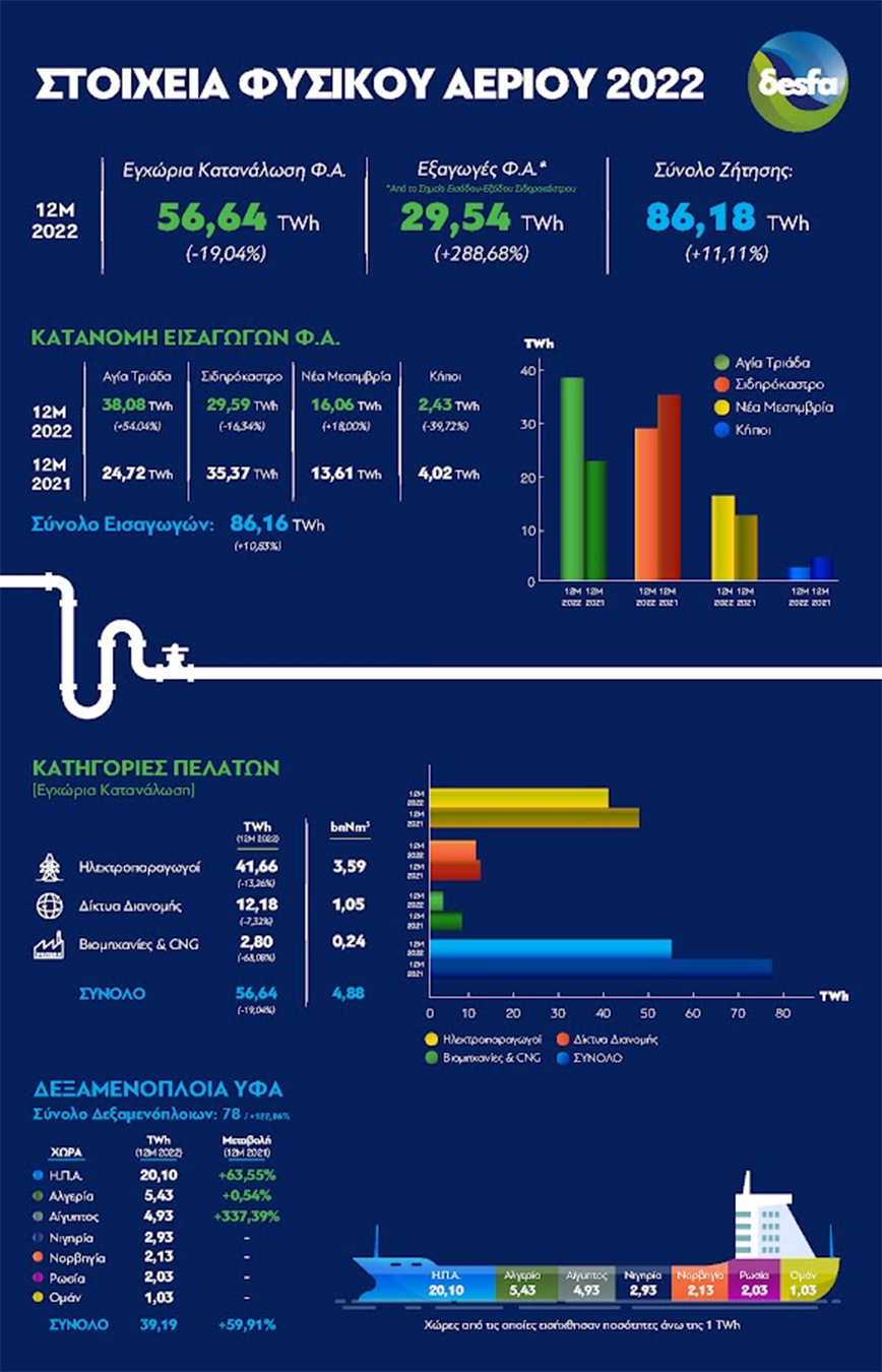 Τα στοιχεία προκύπτουν από τον απολογισμό του ΔΕΣΦΑ για το 2022, σύμφωνα με τα οποία η συνολική ζήτηση (εγχώρια κατανάλωση και εξαγωγές) φυσικού αερίου αυξήθηκε κατά 11,11%, φθάνοντας τις 86,18 Τεραβατώρες (TWh) από 77,56 ΤWh το 2021. Οι εξαγωγές αυξήθηκαν κατά 288,68% (από 7,6 TWh σε 29,54TWh) και κατευθύνθηκαν κυρίως προς τη Βουλγαρία από το σημείο διασύνδεσης στο Σιδηρόκαστρο, ενώ μικρότερες ποσότητες φυσικού αερίου εξήχθησαν και προς την Ιταλία μέσω του αγωγού TAP από τη Νέα Μεσημβρία.