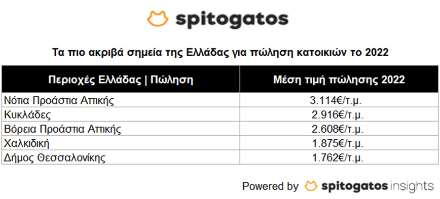 Σύμφωνα με στοιχεία του spitogatos.gr, «πρωταθλητές» στις τιμές πώλησης ήταν τα Βόρεια και Νότια προάστια της Αττικής, το Κέντρο της Αθήνας και τα Προάστια Πειραιά ενώ στην υπόλοιπη Ελλάδα οι μεγαλύτερες αυξήσεις εντοπίζονται, μεταξύ άλλων, σε Πρέβεζα και Σποράδες.