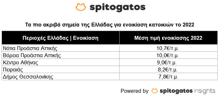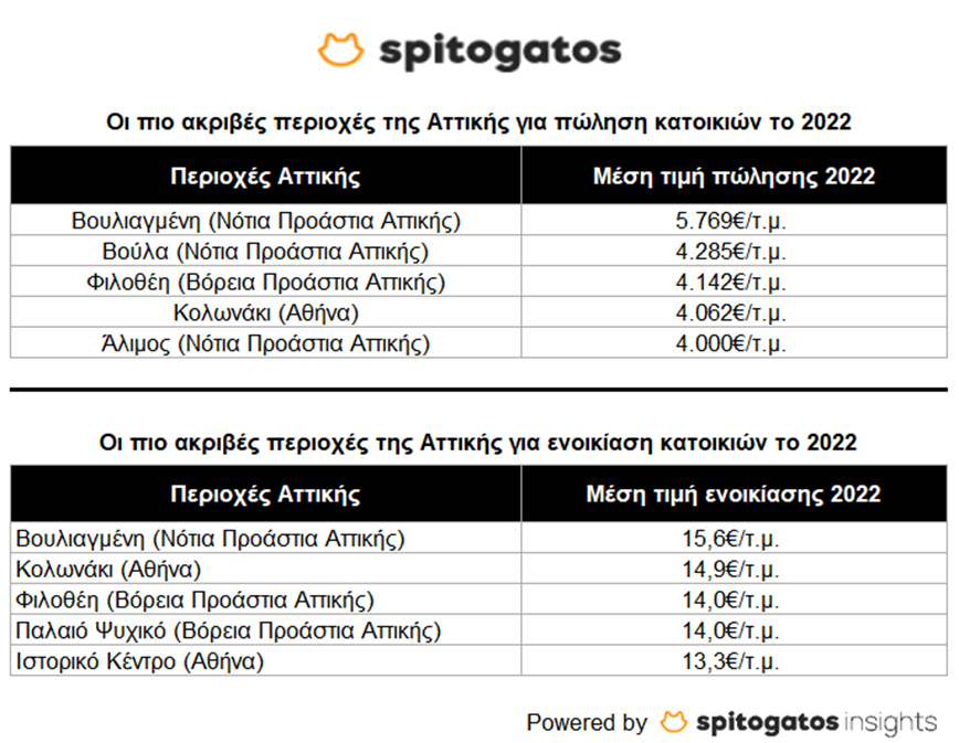 Το 2022 σε όλη την επικράτεια, η αύξηση σε μέσες ζητούμενες τιμές ενοικίασης σε σχέση με το 2021 κυμάνθηκε στο +6,7%, με τις υψηλότερες μεταβολές να εντοπίζονται σε Βάρη–Βάρκιζα (+23%), Φιλοθέη (+21%), Υμηττό (+18%), Κηφισιά (+15%), Πειραϊκή (+14%), Κολωνάκι (+13%), Αγία Παρασκευή (+12%) και Παγκράτι (+11).