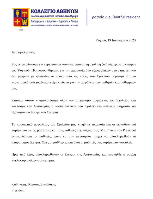 Η ανακοίνωση του Κολλεγίου Αθηνών προς τους γονείς: Σας ενημερώνουμε για περιστατικό που αναστάτωσε τη σχολική ζωή σήμερα στο campus του Ψυχικού. Πληροφορηθήκαμε για την παρουσία δύο εξωσχολικών στο campus, που δεν μπήκαν με φυσιολογικό τρόπο από τις πύλες του Σχολείου. Κρίναμε ότι το περιστατικό ενδεχομένως ενείχε κίνδυνο για την ασφάλεια των μαθητριών και των μαθητών μας.